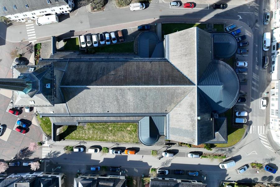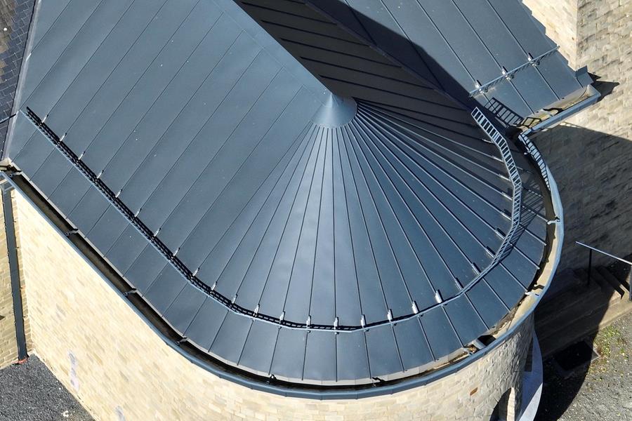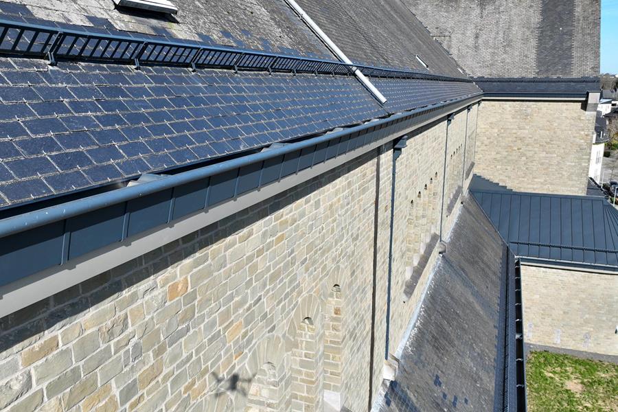 Die neue Aluminiumdeckung wurde farblich auf den verbleibenden Schieferbestand abgestimmt. Alle Anschlüsse von der Turmhaube bis zu den Seitenschiffen wurden individuell angepasst, um eine dauerhafte Abdichtung sicherzustellen.