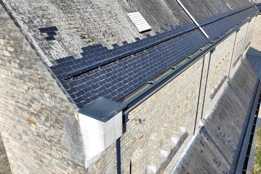 Toitures Jacobs erhielt den Auftrag, die bestehende Dacheindeckung sowie das Entwässerungssystem der Pfarrkirche zu erneuern. Konkret umfasste das Projekt das Abnehmen der alten Schiefereindeckung sowie das Entfernen maroder Holzschalungen im Dachbereich.